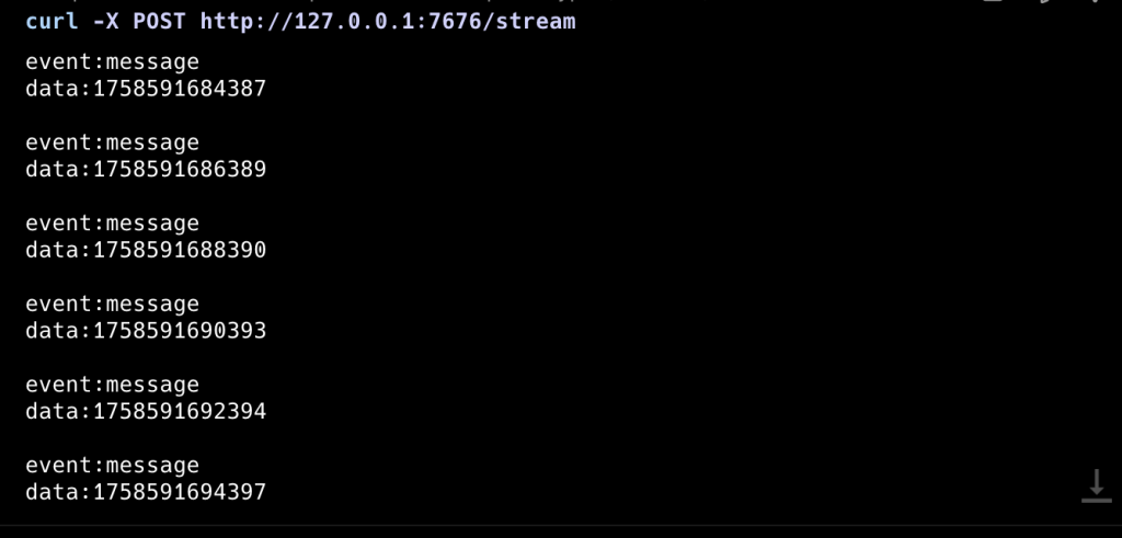ブラウザではGETでstreamしますが、curl -X POSTをしてもリアルタイムにUTC(協定世界時)での1970年1月1日0時0分0秒から現在までの経過時間を永遠表示します。